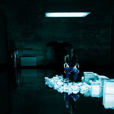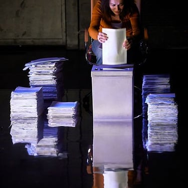 A partir de la retranscription parfois imaginaire de ces voix, j’ai commencé à écrire un monologue polyphonique. Une femme seule en scène, traversée par ces voix contradictoires, glissant dans l’absurdité de ces trajectoires, et dans la folie énigmatique de cette bureaucratie.