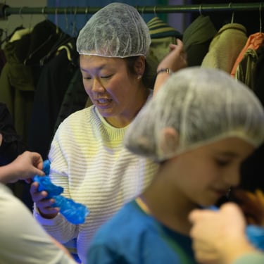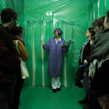 Une actrice a joué le rôle d'une actrice, deux artistes entrepreneurs (atelier du ventre) sont devenus slow managers et on formé 20 complices bénévoles dits “mentors” qui ont eux même formé des dizaines et des dizaines de personnes du public en operateurices pour qu'iels soient à même d'assurer leurs tâches dans l'unité de fabrication de mochi et de packaging.