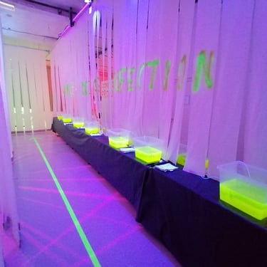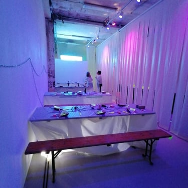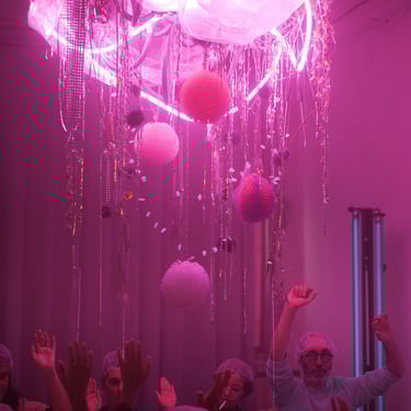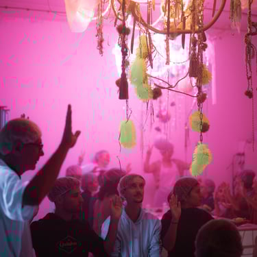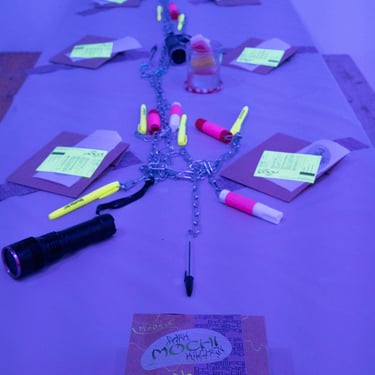 Dark Mochi Kitchen propose d'intégrer une unité de fabrication de mochi, du packaging au produit fini, dans une ambiance oscillant entre bienveillance new-age techno-capitaliste et fiesta collective.