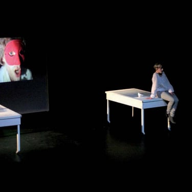Le dispositif se compose d'une étagère et de deux tables mobiles qui sont des agrès pour les interprètes ainsi que d'un plafond réflecteur qui se distorsionne.