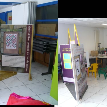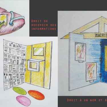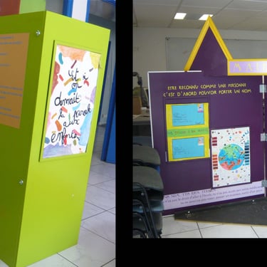Nous proposons aux enfants un dispositif sous la forme d'un village composé de plusieurs modules, des cabanes et une place centrale qui est le lieu de rassemblement. Les enfants construisent ensemble un parcours à l'aide d'un jeu de puzzle grandeur nature. Ces pièces de puzzle leur permettent d'avancer d'un module à un autre, présentant chacun un droit fondamental de la convention. Ces modules sont des espaces informatifs et ludiques où à chaque fois, un petit jeu de rôle ou une situation est proposé.